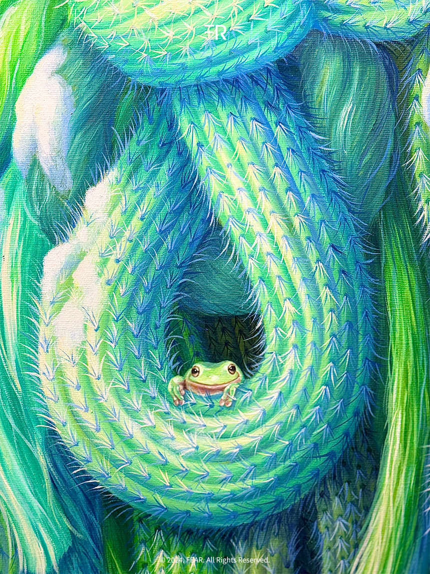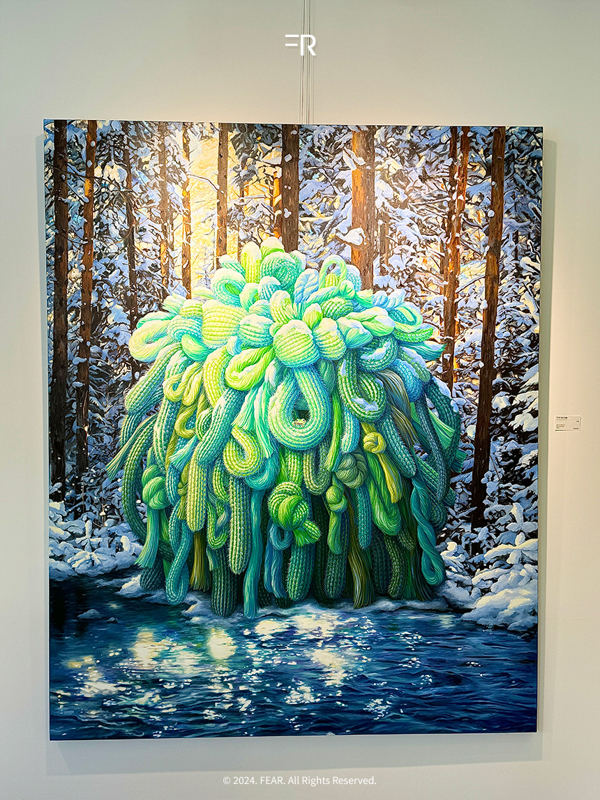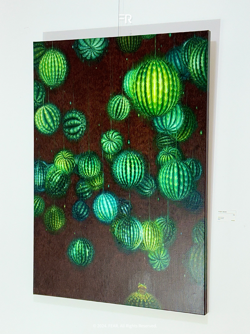 김별 작가는 선인장과 개구리라는 상반된 이미지가 엮여 있는 독특한 풍경을 그린 작품으로 관객을 맞이합니다. 이 작품들이 보여주는 낯선 풍경은 작가의 어린 시절, 불안과 혼돈 속에서 경험한 감정들을 표현하고 있다고 합니다.