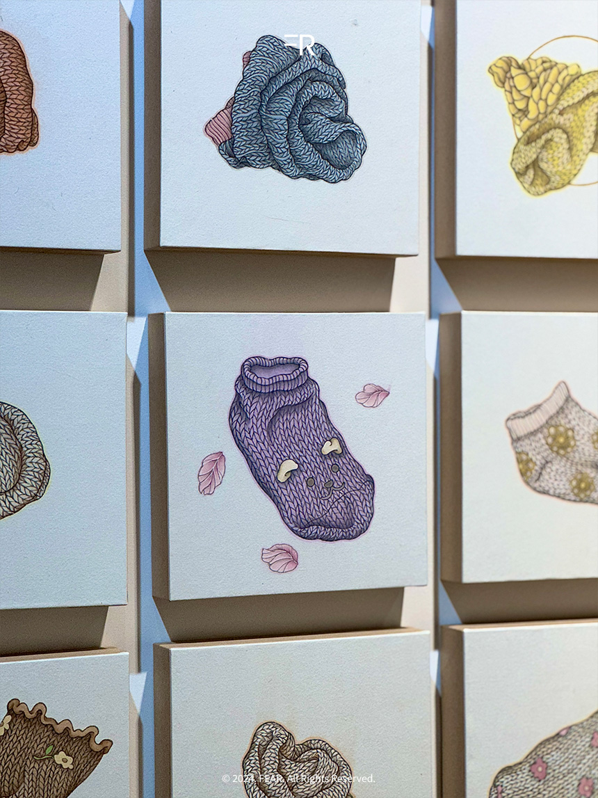 작품 중에서 “Lost Socks” 시리즈는 짝을 잃은 양말들이 모여 또 다른 이야기를 만들어 가는 독특한 상상력을 보여주었습니다. 평범한 일상의 물건들이 새로운 의미를 얻는 과정이 흥미로웠고 이 작은 상상들이 보는 이에게 공감을 불러일으켰습니다.