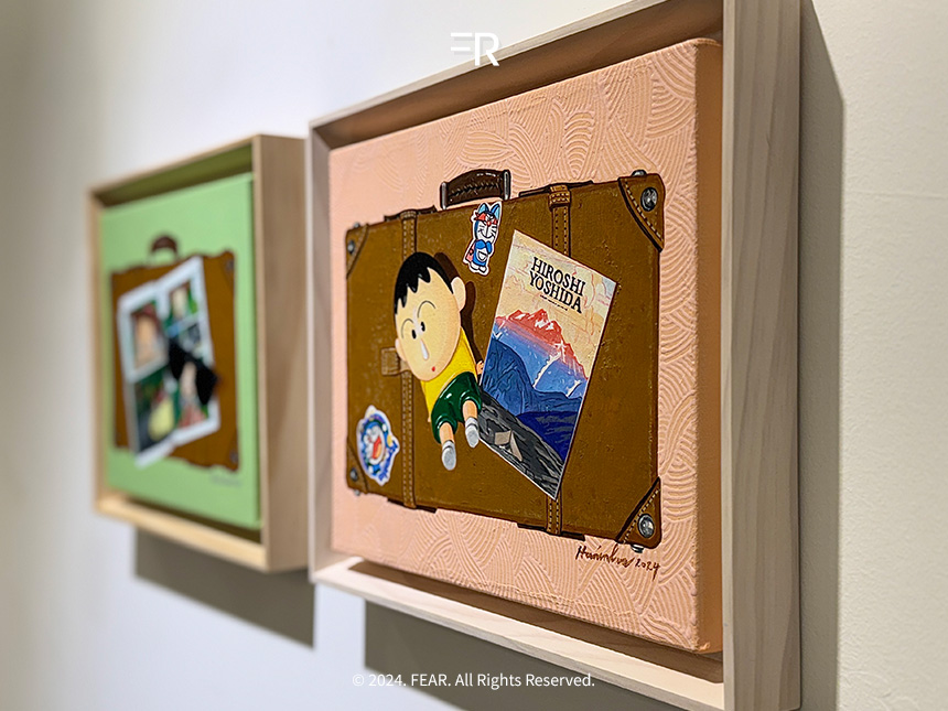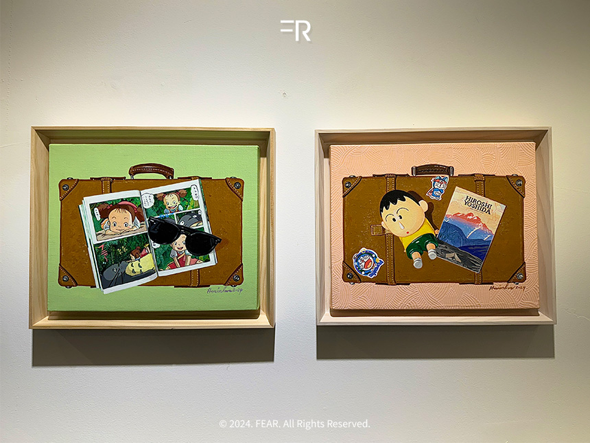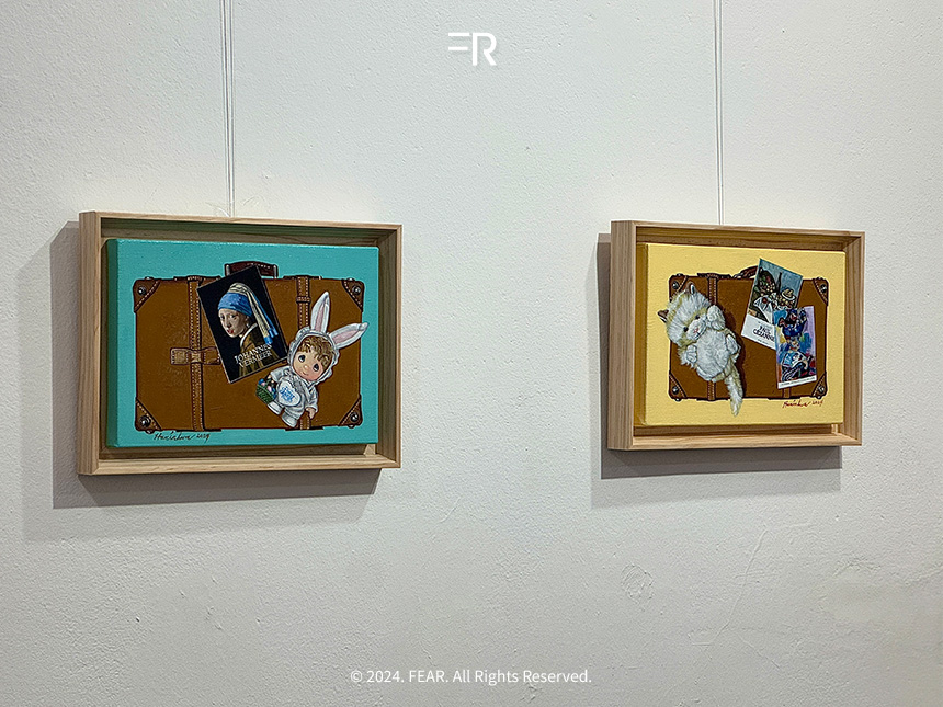 한인화 작가의 작품들은 여행에 대한 설렘을 가득 담고 있었습니다. 특히 눈길을 끈 것은 여행가방 위에 놓인 인형들과 다양한 나라의 책들이었습니다.