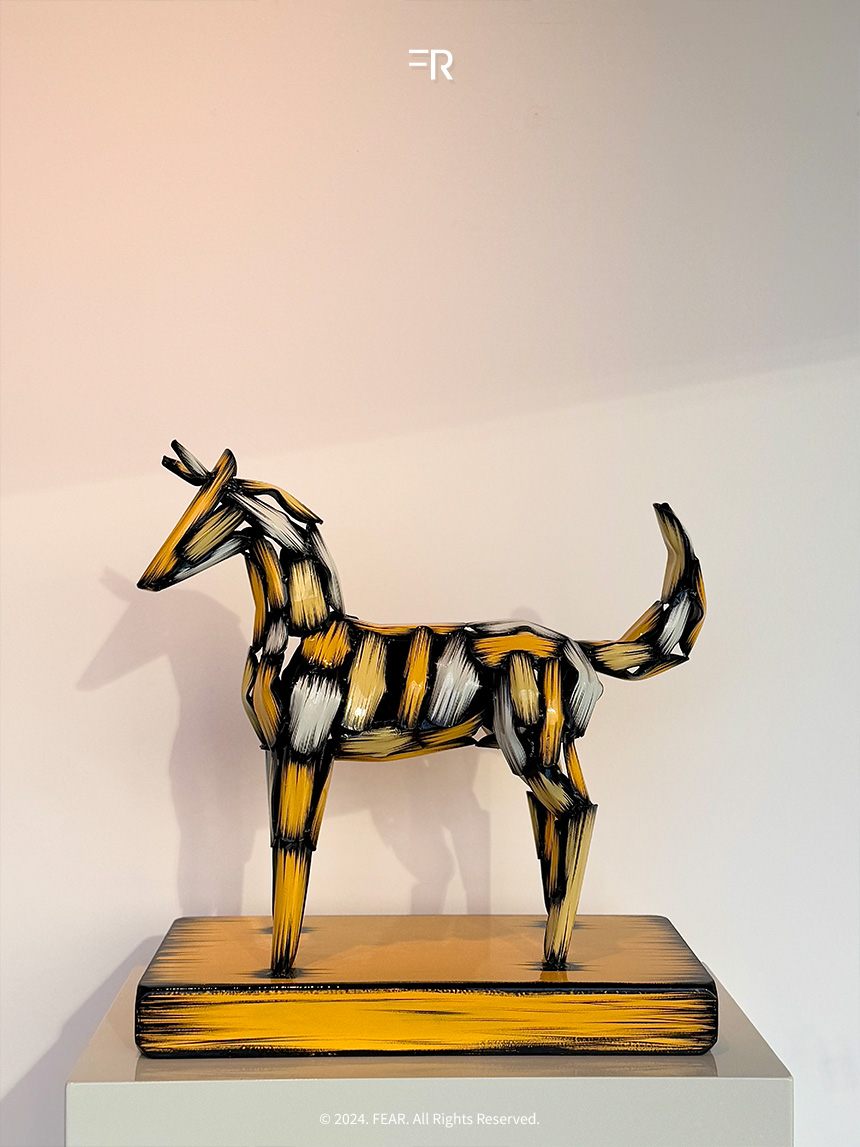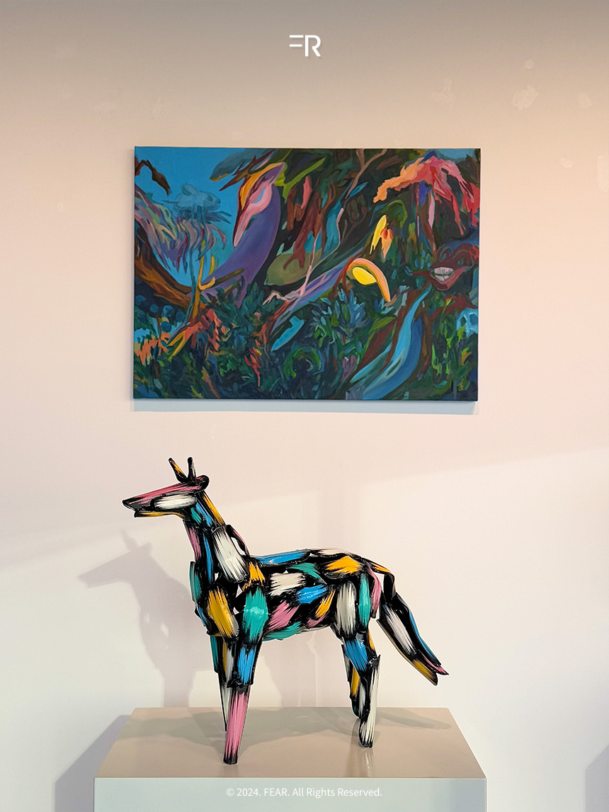전시장에 들어서자마자 눈길을 사로잡은 건 김우진 작가의 조각 작품이었습니다. 말과 사슴 같은 동물 형상들이 유년 시절의 꿈속을 걷는 듯한 기분을 느끼게 해주었습니다. 귀엽거나 아름다운 동물이 아닌 작가의 내면에서 우러나온 이야기가 담겨 있는 듯한 조각 작품이었습니다.