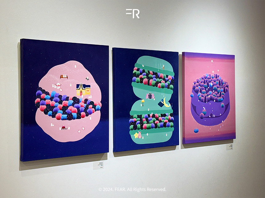 지은 작가는 디저트와 기억을 소재로 낙원을 표현합니다. 작품을 보며 저도 자연스럽게 디저트에 대한 행복한 순간들을 떠올리게 되었습니다. 특히 빵 부스러기로 형상화된 캐릭터들이 너무 귀여워서 계속 눈길이 갔습니다. 힘든 시기를 지나온 저에게 작은 행복의 소중함을 다시 일깨워주는 느낌이었습니다.