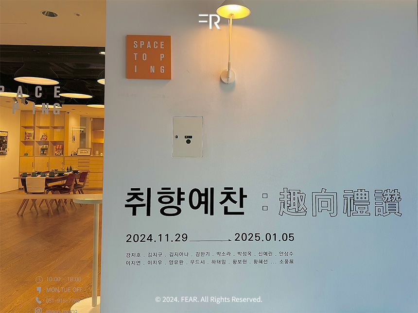 올해의 끝자락, 부산의 스페이스 토핑에서 열린 전시 <취향예찬 : 究向禮讚>를 다녀왔습니다. 취향에 관련된 이번 전시는 많은 작가들이 참여했습니다. 제가 잘 알지 못하는 작가도 있고, 전시를 다니며 많이 봐 왔던 작품들과 작가도 있었습니다. 그럼 시작해보겠습니다!