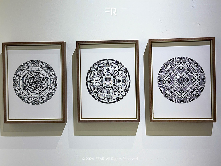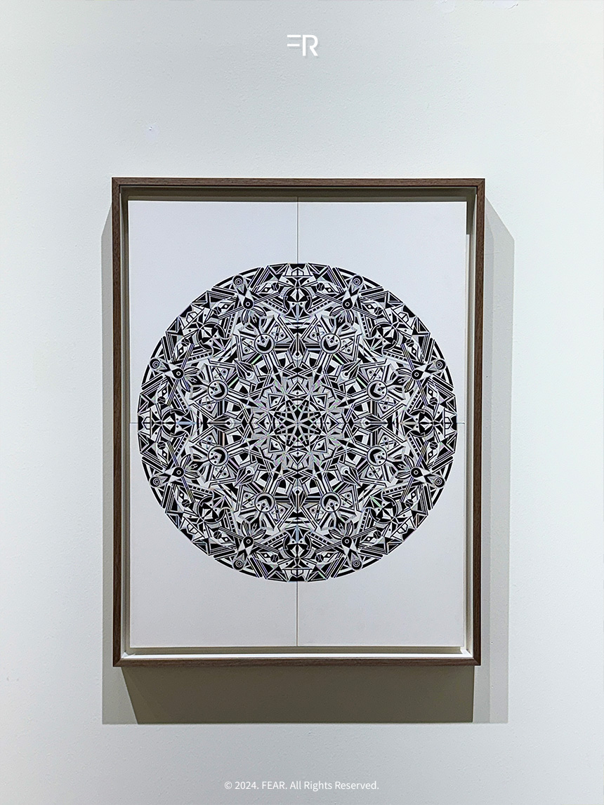 방상환 작가는 기하학적 도형을 이용해 작품을 구성하며 끊임없는 실험과 탐구를 통해 자신만의 미학을 구축해 나갑니다. 도형들이 만들어내는 반복적이고 기계적인 리듬은 작품 전체에 독특한 질서를 부여합니다. 그 과정에서 작가는 자신만의 작업 방식을 발견하고 이를 통해 자신다운 그림을 찾아간다고 합니다. 도착점을 설정하지 않고 그려나가는 방식은 보는 이로 하여금 작가의 창작 과정에 함께 참여하는 듯한 느낌을 줍니다.