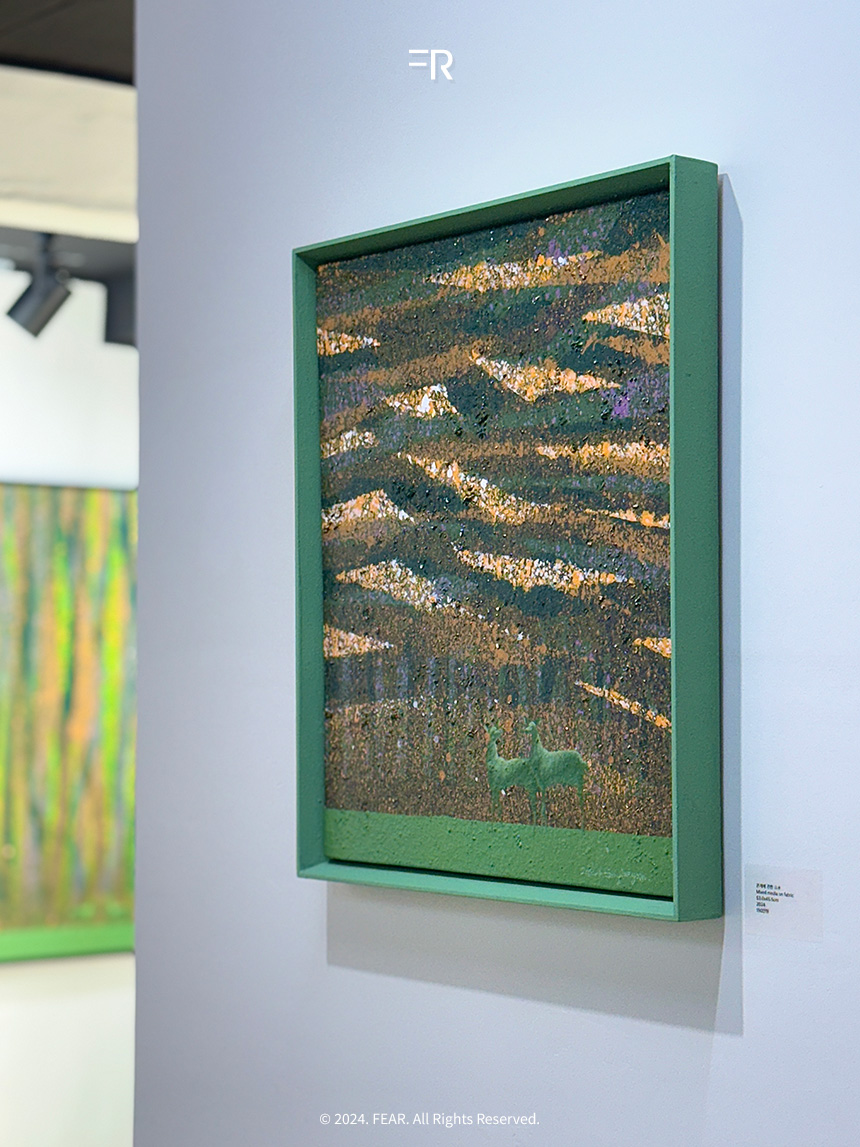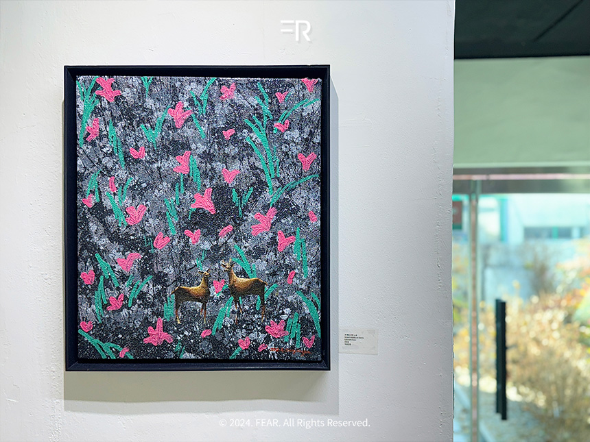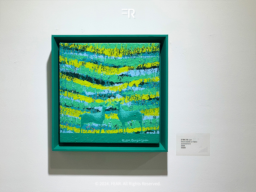 전시에서 가장 인상 깊었던 점은 관계라는 주제를 산과 물, 사슴 같은 자연의 이미지를 통해 풀어냈다는 점입니다. 반복적으로 쌓아 올린 색의 층과 단순화된 산수는 관계가 쌓이고 변화하며 단단해지는 과정을 은유하는 듯 했습니다. 사슴은 관계의 상징으로서 오래도록 이어지고 싶은 마음을 담아내며 작품에 특별한 생명력을 더한 작가님의 사슴이 눈에 많이 들어왔습니다.