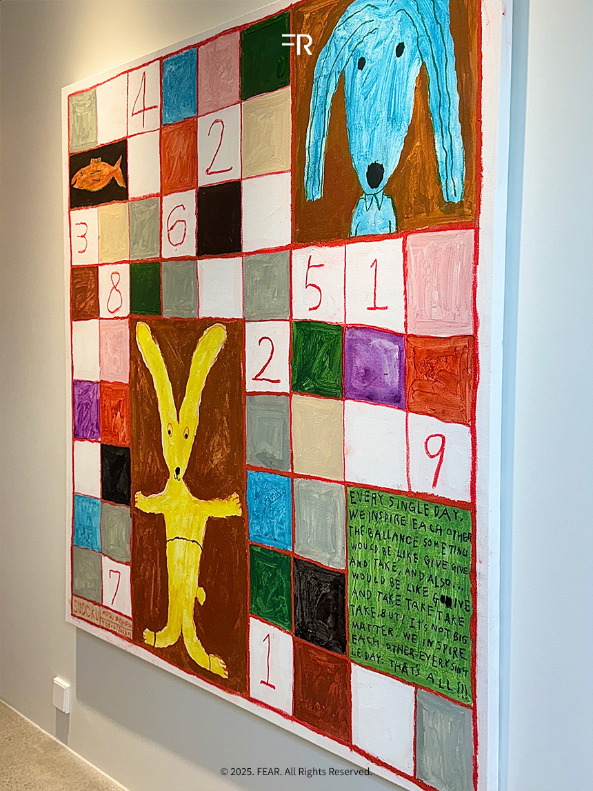 처음에는 그림이 단순해 보였지만 가까이서 보면 세련된 색감과 구성이 보였습니다. 자유롭게 움직이는 붓질이 만들어낸 조화로운 색깔들은 눈과 마음을 동시에 사로잡았습니다. 선과 점이 겹치는 과감한 표현은 그녀의 유머와 창의적인 에너지를 그대로 담고 있었었습니다.